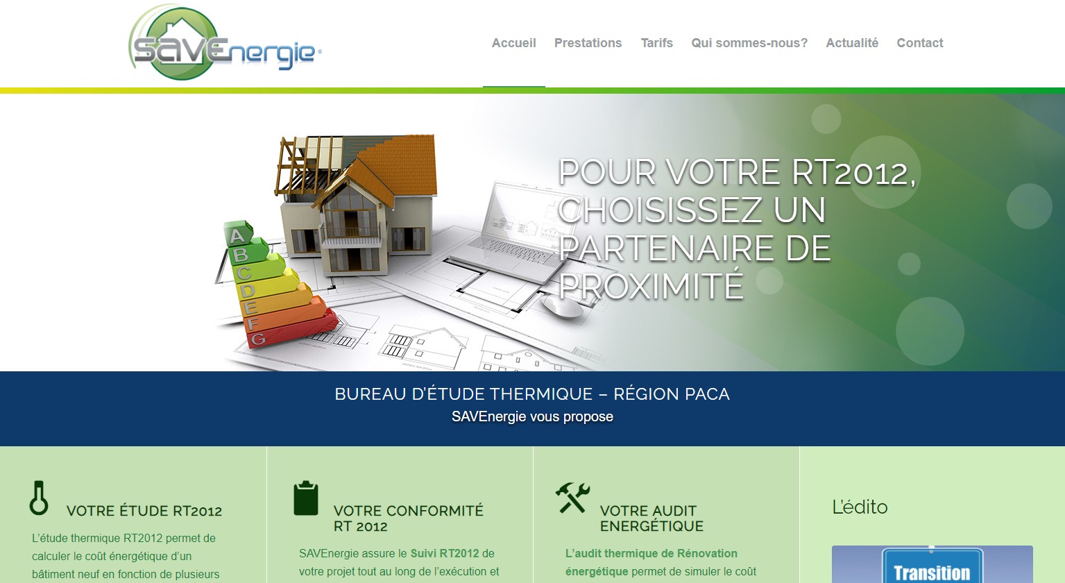 SAVEnergie est un bureau d’étude thermique proposant son expertise dans l’ensemble de la région Provence-Alpes-Côtes d’Azur. Vous pourrez notamment faire appel à ses services pour un audit énergétique de votre bien immobilier, pour une mise en conformité RT2012 de fin de travaux ainsi que pour une étude thermique RT2012. Que cela soit pour un projet de construction, pour un projet de rénovation ou pour réduire la consommation d’énergie de votre bien, vous pourrez faire appel à SAVEnergie.